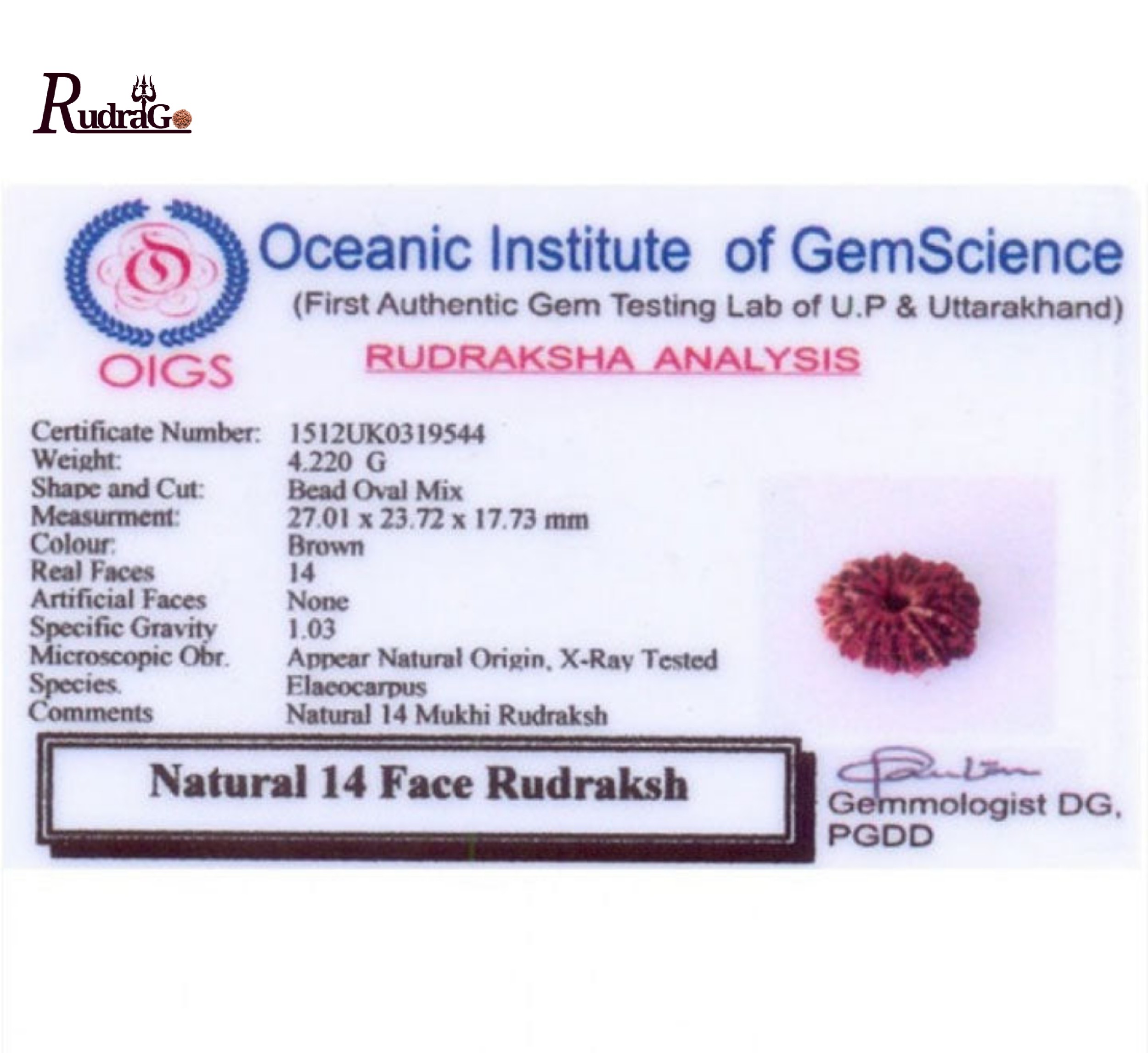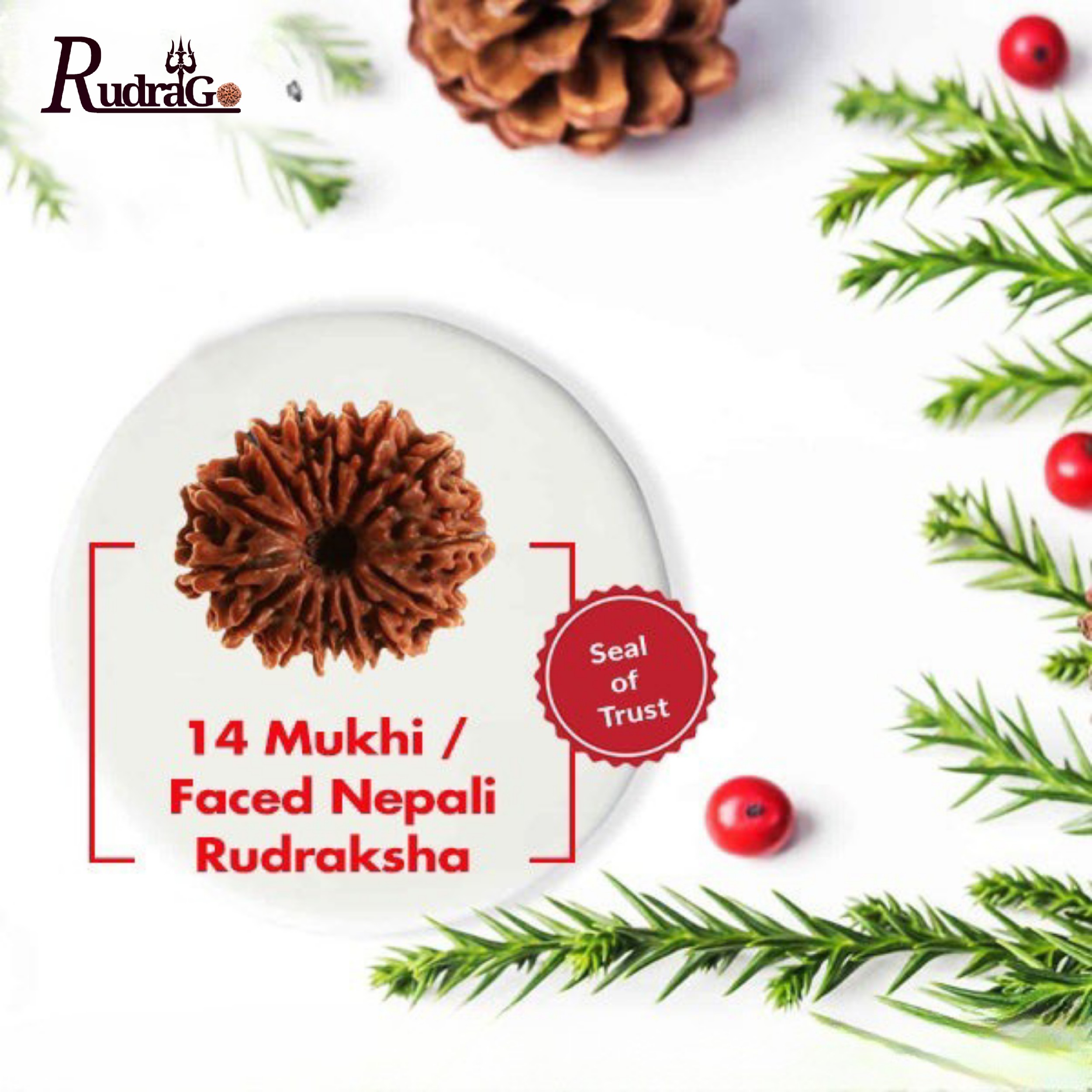 The 14 Mukhi Rudraksha is also known as Dev Mani, a divine gem believed to have originated directly from Lord Shiva's eyes; he himself wears this bead. It is ruled by Lord Hanuman, the god of physical and mental strength and power, and is associated with Mars. Hence, it evokes strength, willpower, and determination.